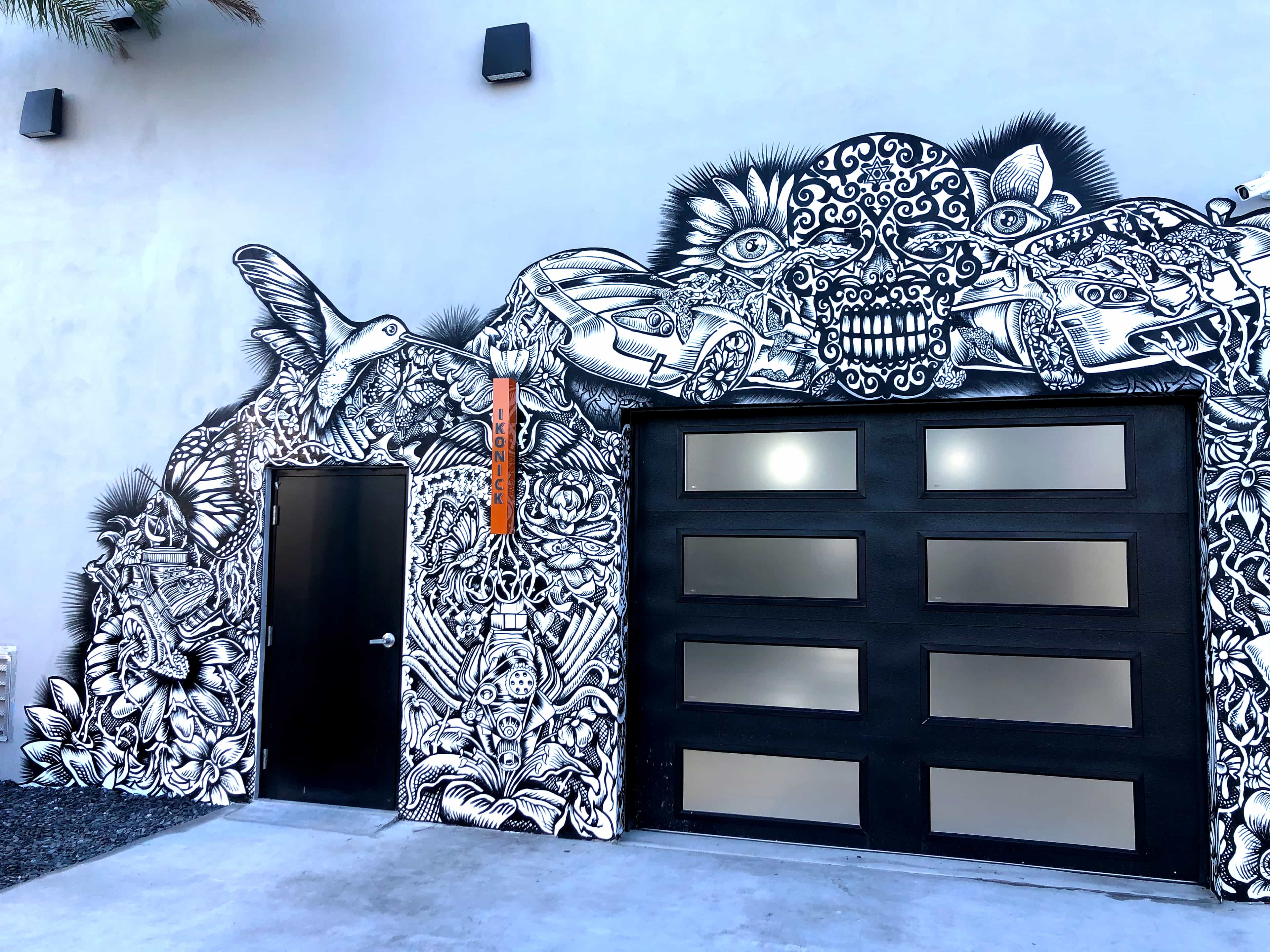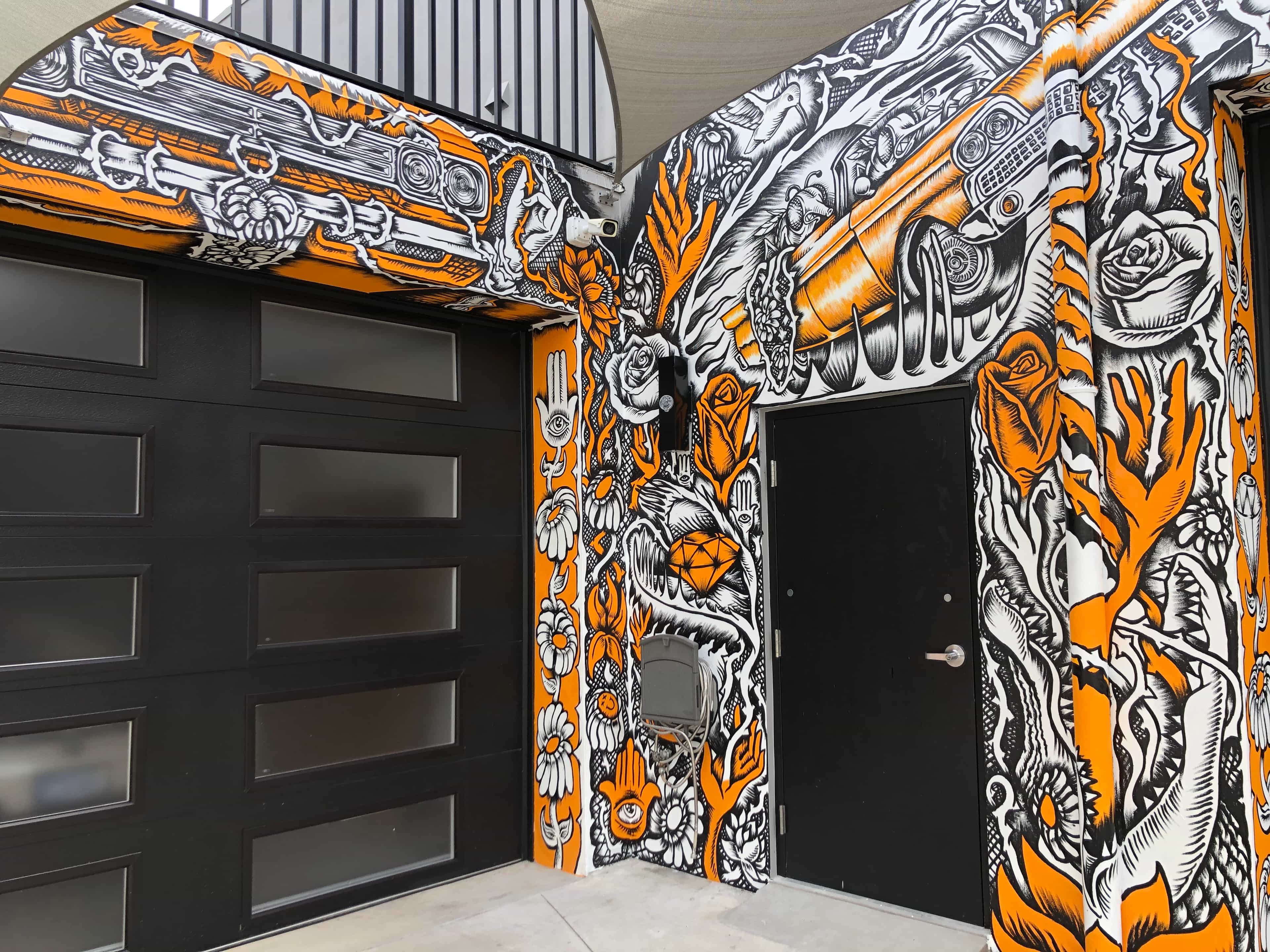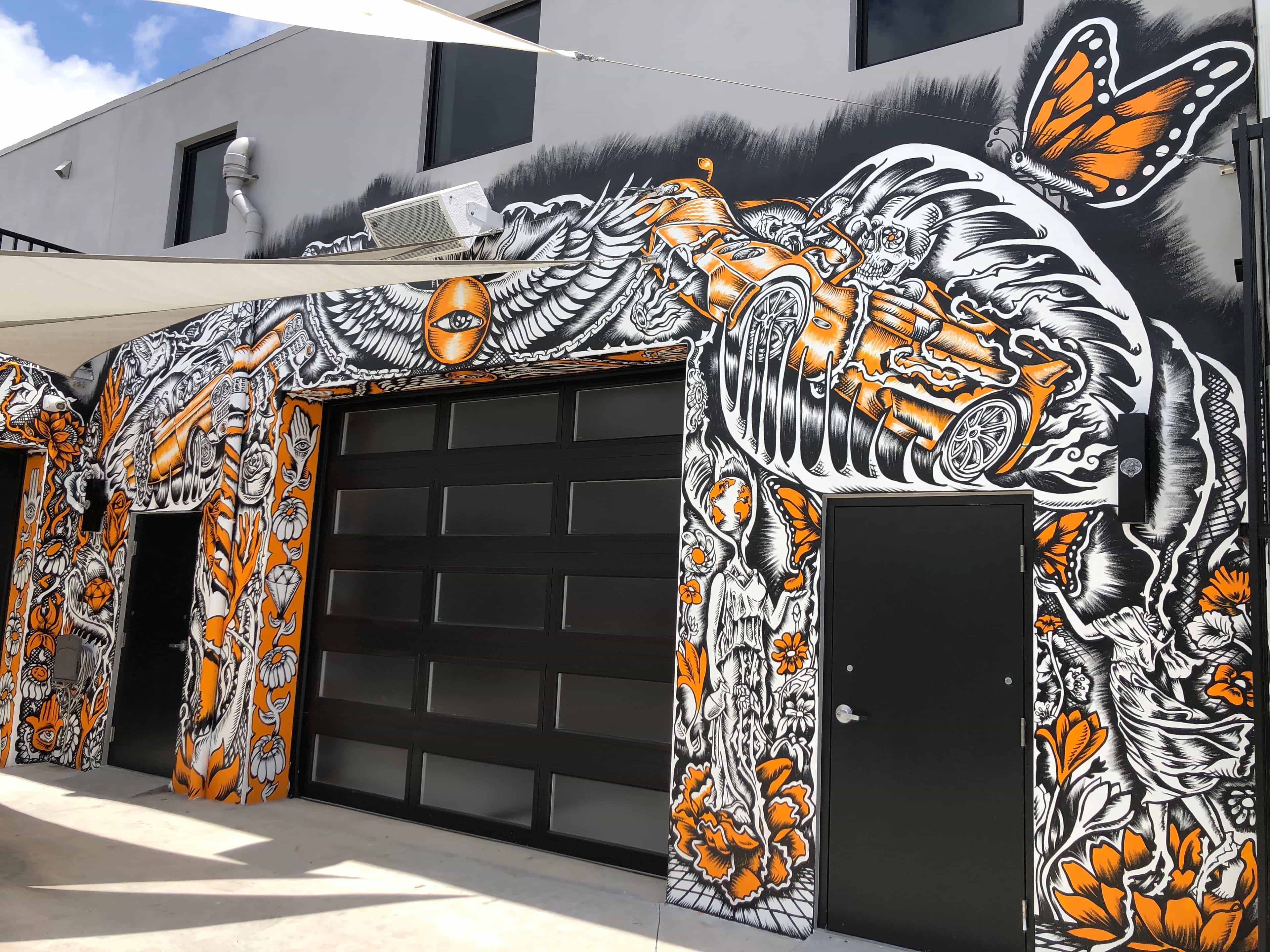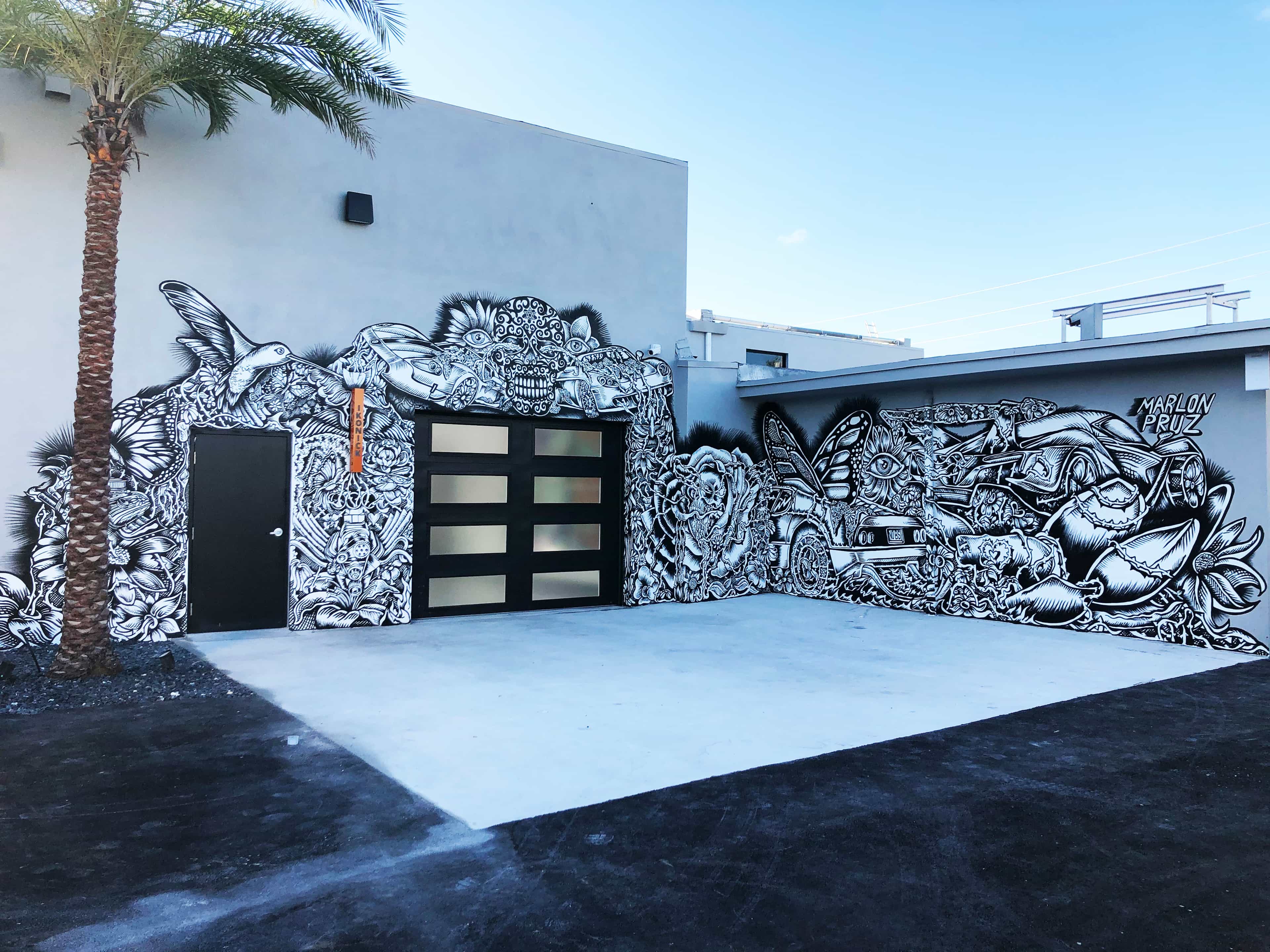 Series of Murals painted for Ikonick Motors car collection decorating the entire facade of the garage.