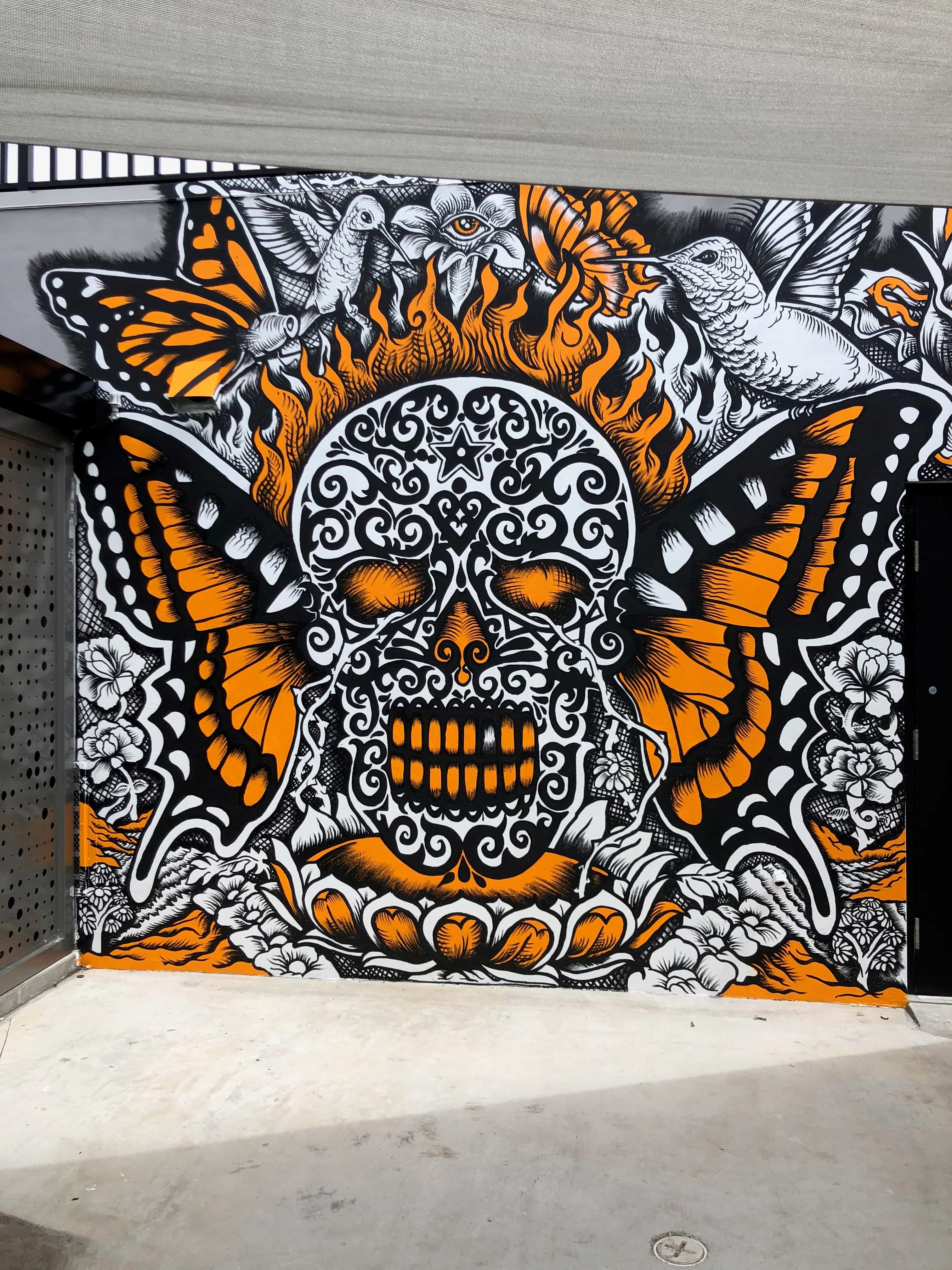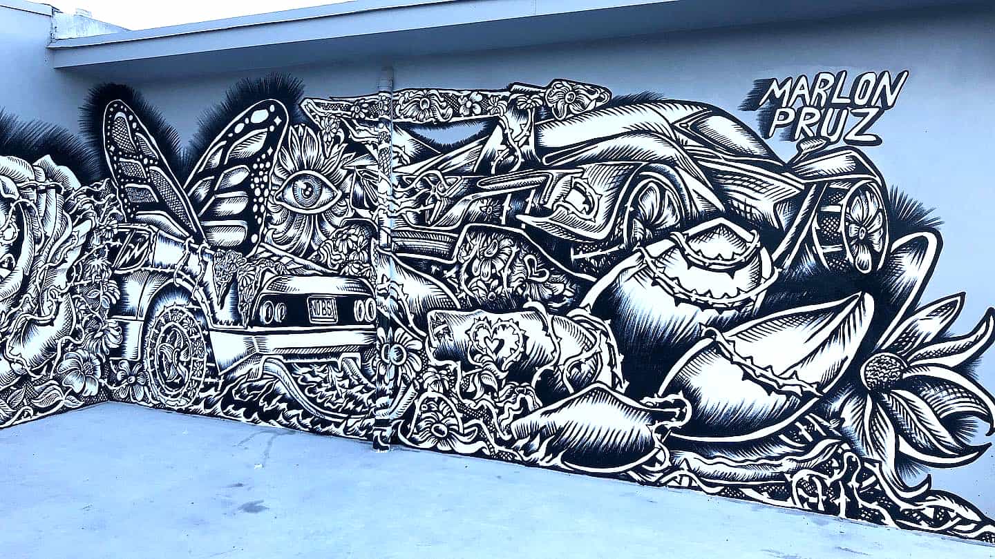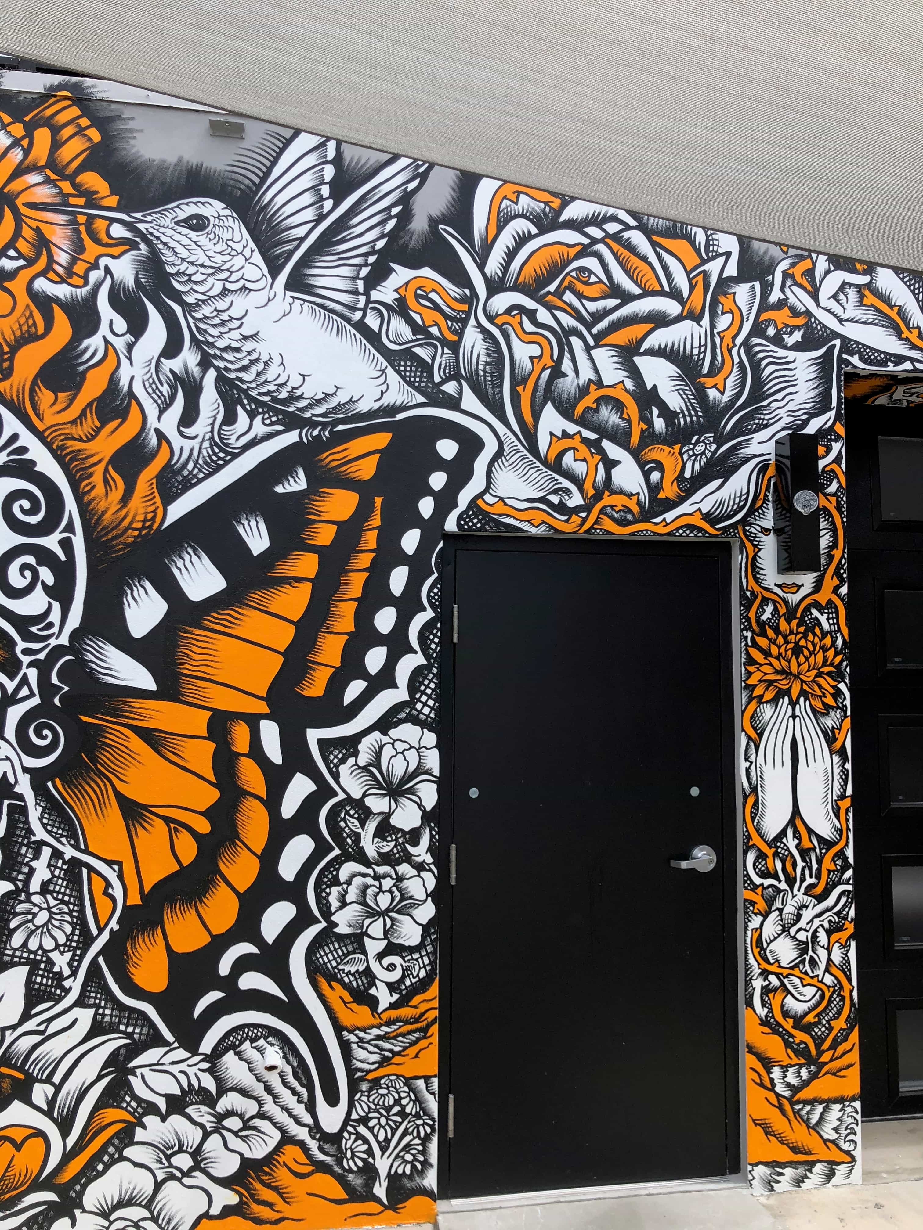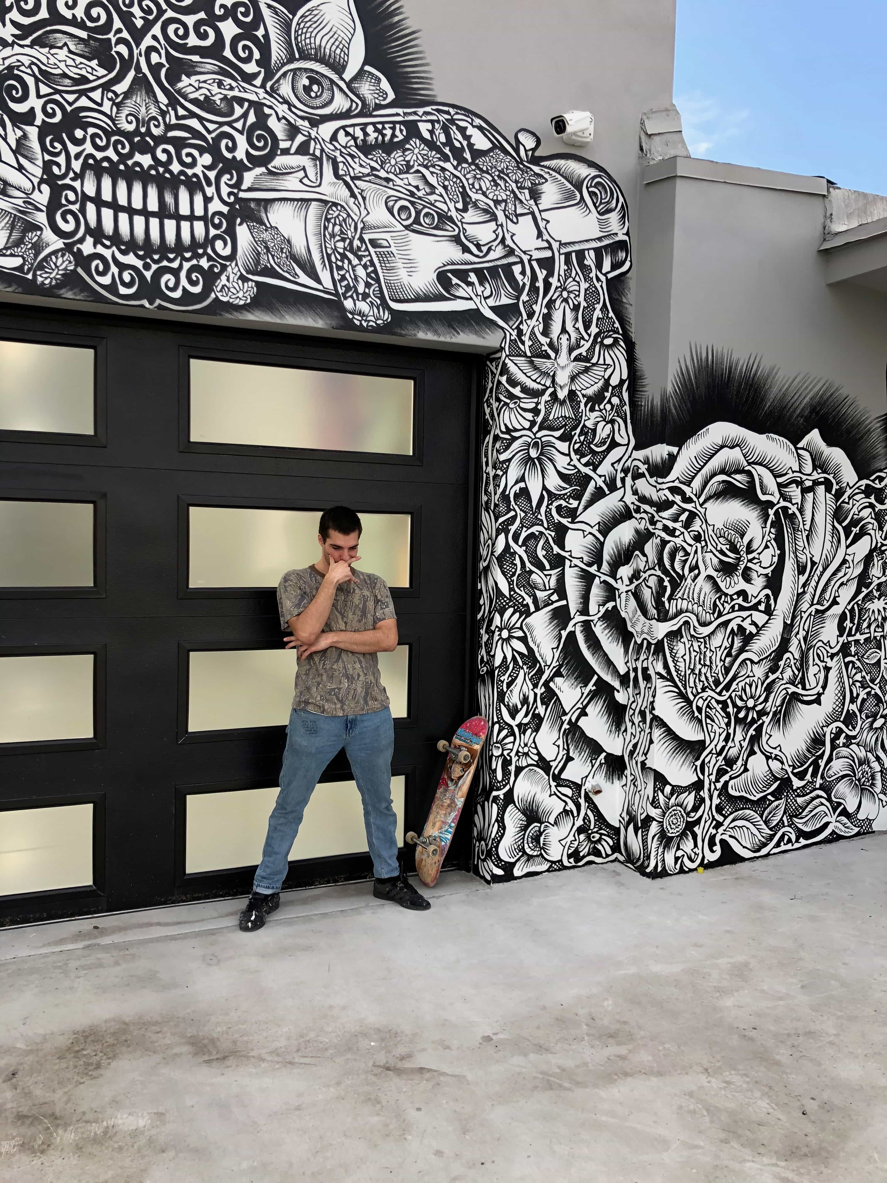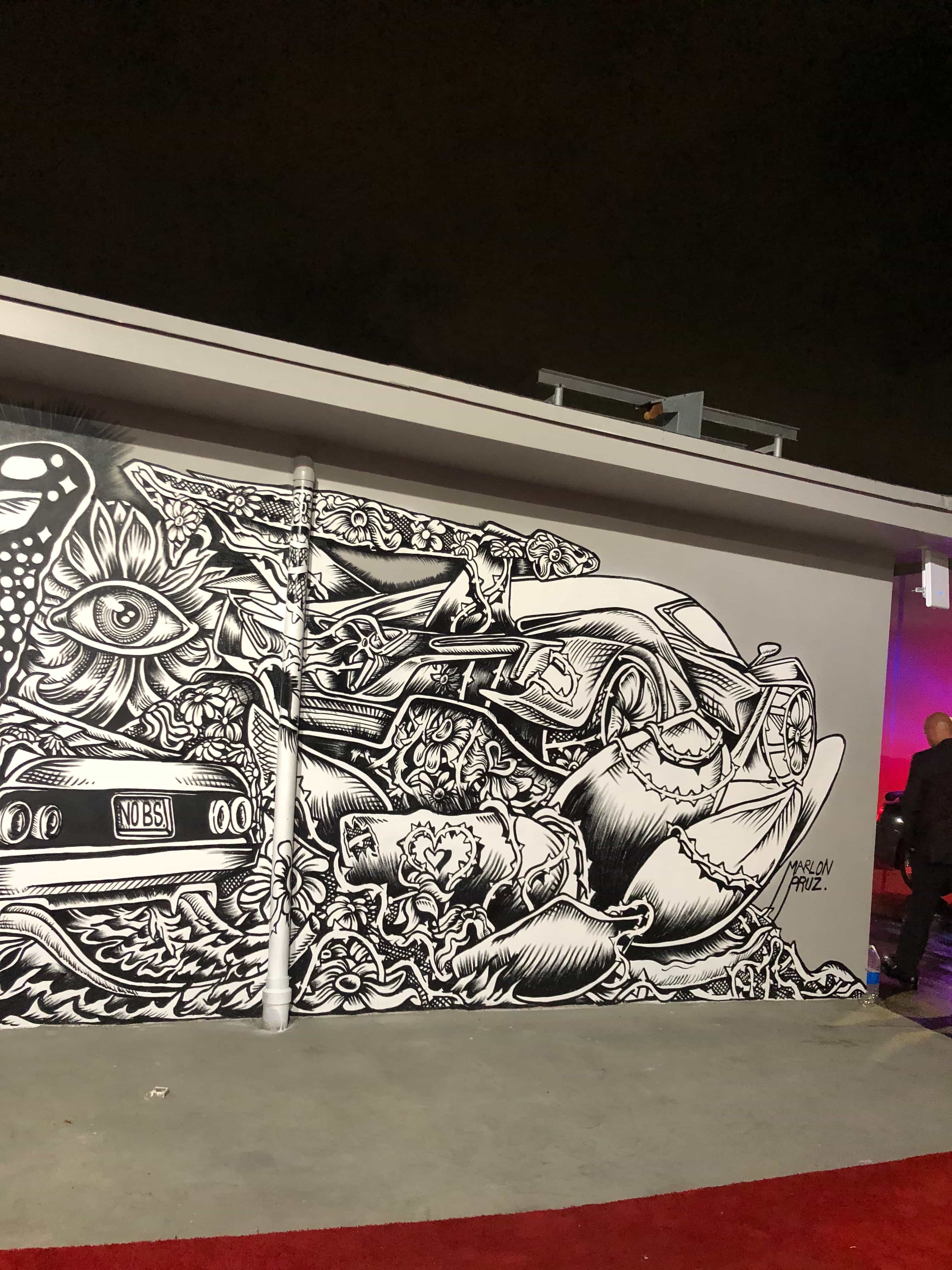 Series of Murals painted for Ikonick Motors car collection decorating the entire facade of the garage.