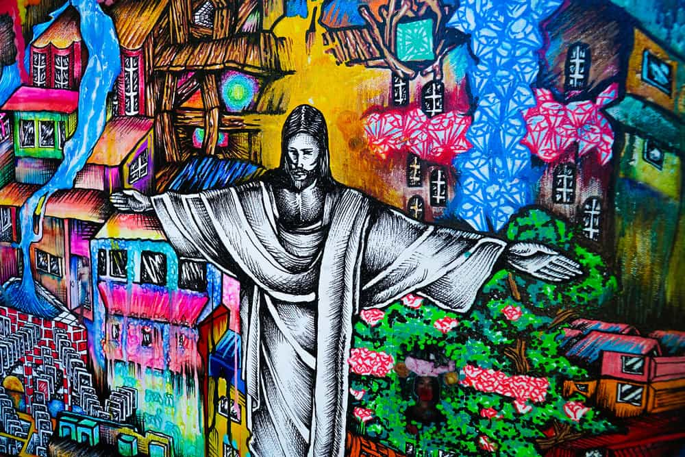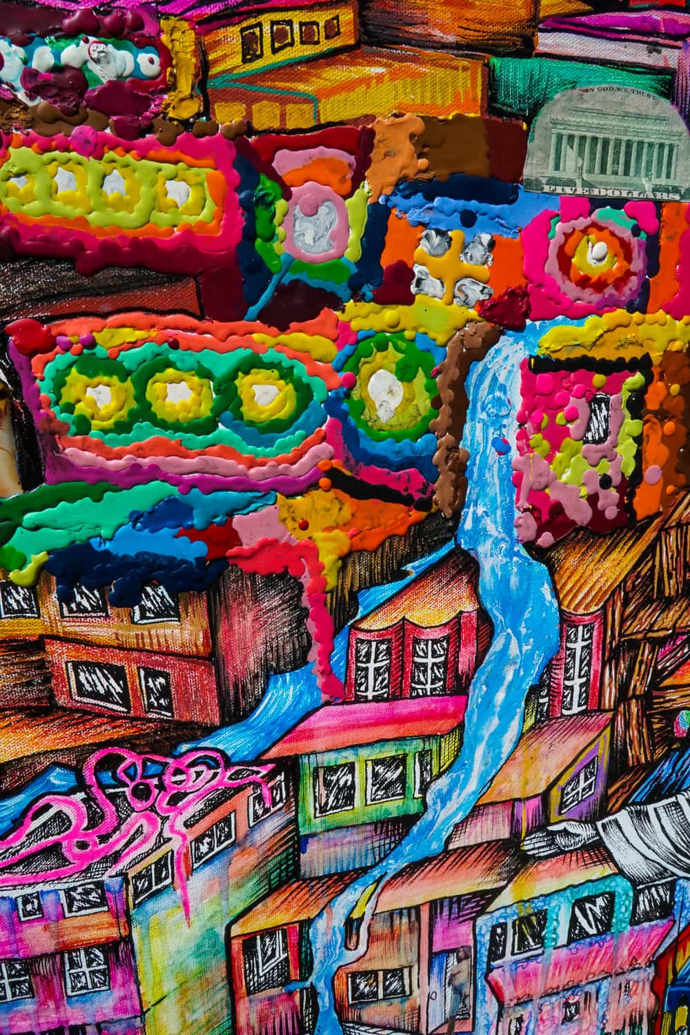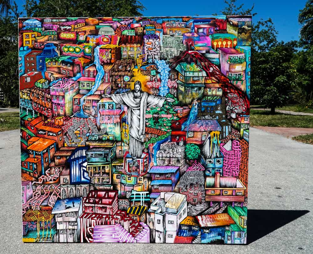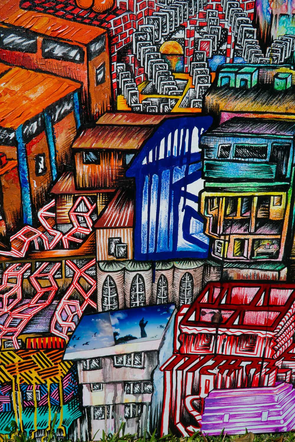 I’ve always been fascinated with favelas and the unregulated ingenuity and creativity that goes in to the creation and maintenance of these societies. Almost everything in these vast and unique towns is make shift and constructed by the people who reside in them. This inspired me to make a piece depicting the favelas in which every building was painted with a different material. I placed the famous Christ the Redeemer landmark in the middle, because these diverse, colorful, seemingly impossible Favelas get swept under the rug when it comes to government funding and public attention.