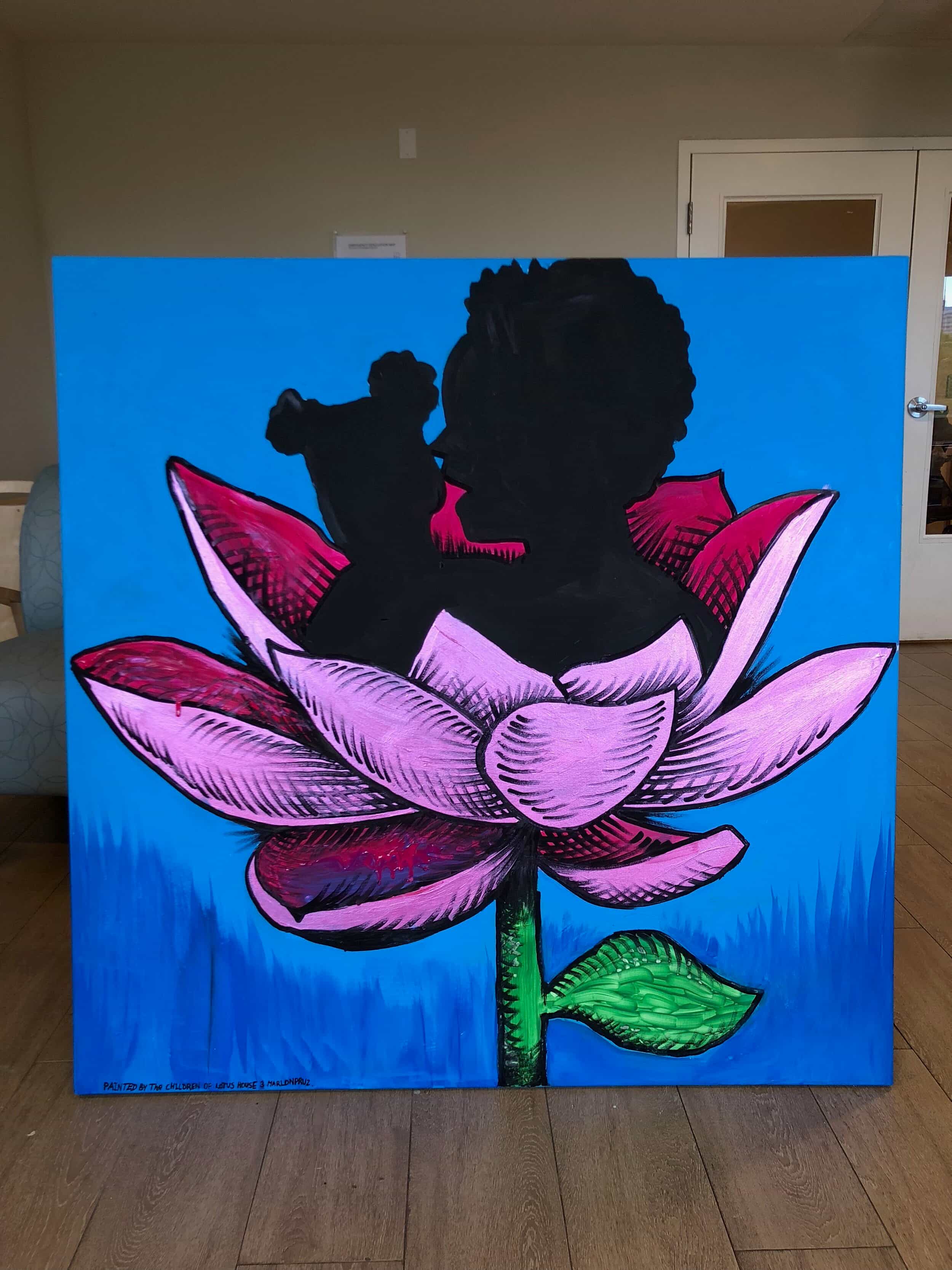 The Lotus House is a unique resource center and residential facility serving homeless women and infants in the heart of Overtown. A spa day for the mothers was set up and I guided a 3 hour art session with their children, so the mothers could take the day off and relax. Together we painted this masterwork, Which became a permanent piece in shelter.